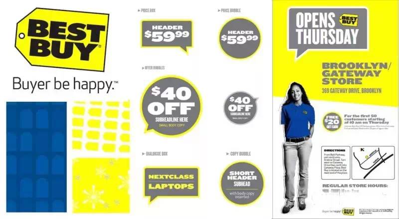 百思買標志的主色為黃色、藍色,輔助色為黑色、灰色和紅色。該品牌輔助圖形包括“標簽圖形”“對話框”“文本氣泡”“價格框”“價格氣泡”“標題區”等多樣化的運用形式,每一種形式都有不同的目的和內容規范相對應。