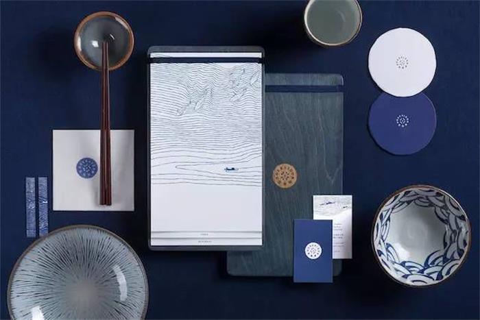 說起日式風,肯定少不了日料店。這家日料餐廳,以日本傳統花紋樣式青海波為品牌主要視覺元素,通過靛藍色和白色混搭的青海波圖案,呈現出自由開放的樣貌。簡約流動的線條,與插圖結合,頗有意趣。不僅將日本民間文藝元素進行圖形化展示,也是餐廳提供新鮮食材的一種比喻性表現。餐廳的LOGO以一個簡化的圓形米飯碗樣式進行呈現,圖形居中,文字進行環繞,簡約中又有立體突出的效果。