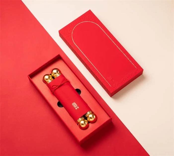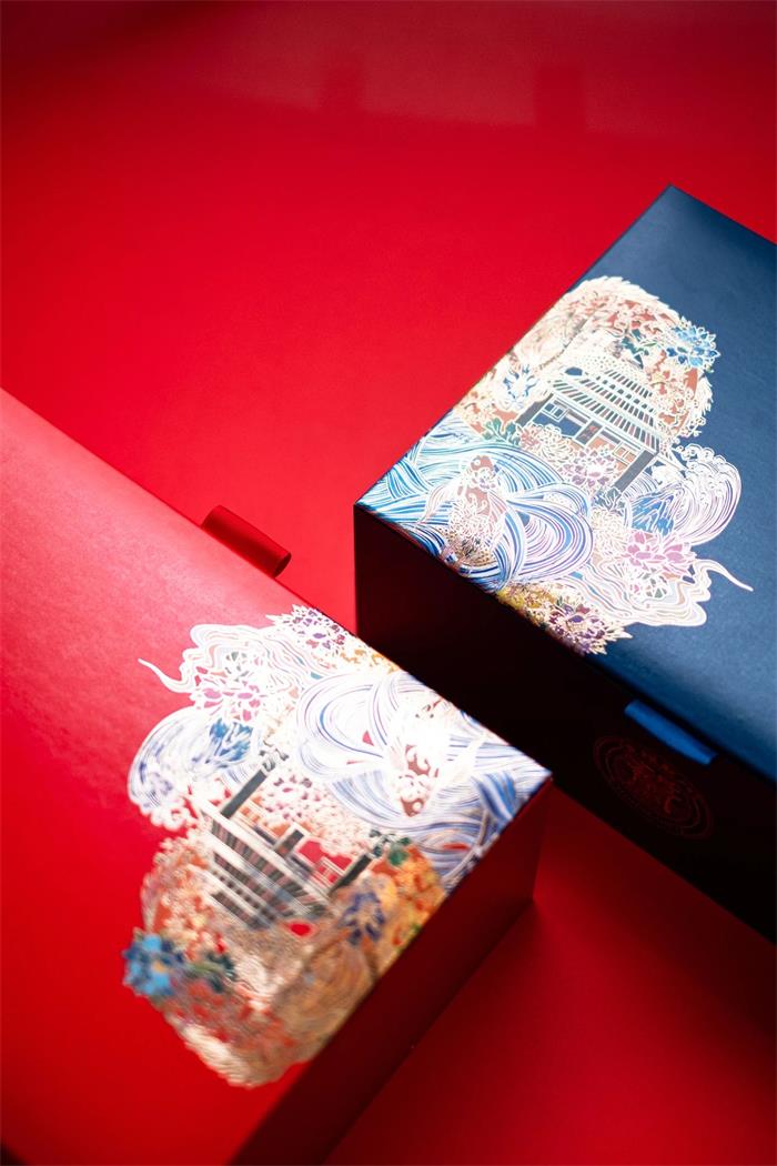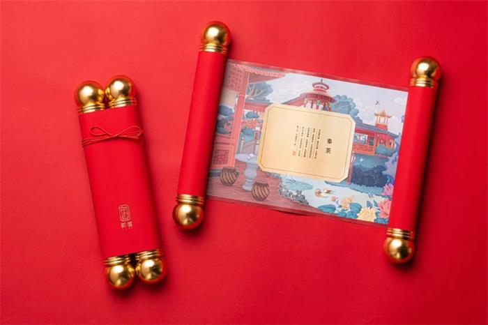 這款御喜茶以國潮風為主視覺,靈感來源于帝王所用物--“御”的敬稱以及圣旨的外觀概念,旨在從深厚的文化底蘊中挖掘經典元素,因而紅色包裝的圣旨外觀完成了茶葉的全新形象,另外同色的紅細帶,固定“圣旨”的同時兼顧了美觀性。有意思的是兩端的金屬鏤空軸柄設計,軸端處可扭開半圓,實現擴容的作用,進而能夠合理利用空間。展開后的“圣旨”畫面描繪了宮廷歲月靜好的情景,底襯賦以《奉茶》詩文,拉近與消費者的距離。金色外盒則以線條勾勒了宏偉的宮門形象,兩側繪以祥云深壓紋,一繁一簡,強化視覺張力。