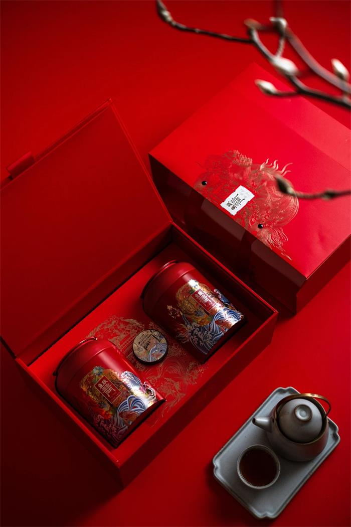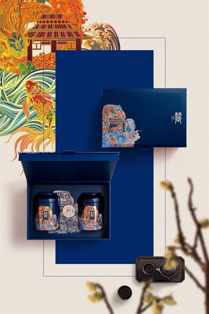 對應插畫上的龍門造型,加以藝術化處理,再次呼應產品主題。內盒的小罐茶葉采用鋁制包裝,罐身上粗下細的漸變設計,以桶式的設計呈現優雅沉穩的包裝屬性。打開后的包裝還可發現魚躍龍門的插畫以鍍金工藝的方式印在內盒底部,搭配鮮明配色,形成良好的視覺互動。